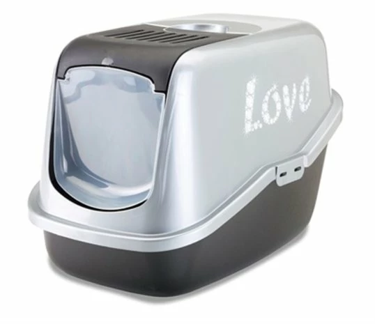 De Savic Kattenbak Nestor Impression Zwart / Zilver van 56 x 39 x 38,5 cm is een modern kattentoilet met topopening voor een snelle reiniging. Deze kattenbak is door het handige design erg makkelijk schoon te maken. De voorkant gaat extra ver open, waardoor uitscheppen gemakkelijk gedaan kan worden zonder de hele kap te hoeven verwijderen. De onderbak heeft een extra hoge achterzijde waardoor lekkage voorkomen wordt. Daarnaast is de kattenbak uitgerust met handgreep, kunststof draaideur en verwisselbare koolfilter om nare luchtjes rondom de kattenbak te voorkomen. De kattenbak is uitgerust met de opdruk ‘love’ aan de zijkant.
