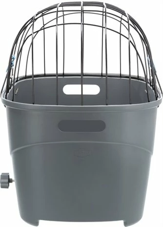 De Trixie honden Fietsmand Voor Bagagedrager Met Draadkoepel Kunststof Grijs 46 x 36 x 47 cm is een kunststof fietsmand voor de hond, met snelbevestiging en ligmat.