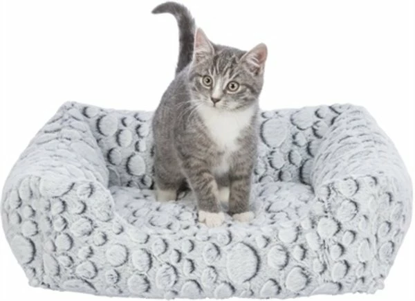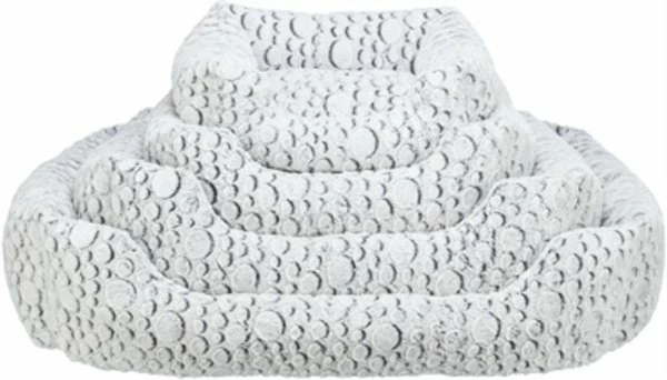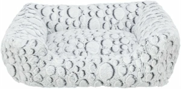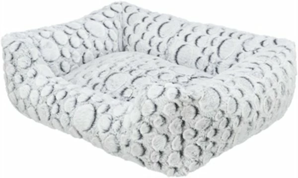 De Trixie Mand Mila Hoekig Pluche Wit / Grijs van 50 x 40 cm is een originele hondenmand met een leuk patroon en zachte structuur pluche, met slipvaste onderkant. Deze mand is een ware blikvanger in jouw huis! De bijzondere stof heeft een leuk patroon van cirkels en is daarnaast heerlijk comfortabel door de zachte pluche structuur. De polyestervlies vulling zorgt voor voldoende steun en op de rand kan de hond fijn zijn kop laten rusten. Bovendien zorgen de lage instap in de rand en slipvaste onderkant dat het dier zonder moeite in- en uit de mand kan stappen.